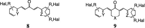The majority of analogs are symmetrical consistent with ease of synthesis, however, many asymmetric versions have been prepared including chalcone variants [,]. The terminal aromatic rings may contain up to three different substituents and one or more nitrogen atoms in the ring to deliver heteroaromatic pyridine analogs (8, 9, Y = Z = N) with N located at o, m and p sites. The most popular phenyl ring substituents are OR and OH followed by halogen atoms. However, N- and C-linked substituents have been probed as well. The terminal phenyls have also been replaced with heteroaromatic rings such as thiophene in a few cases. The central ring in 9 most often appears as a 5- or 6-membered ring, although a number of 7-membered ring congeners are known. The central 6-ring is often accompanied by X = C, NR, O, S and SO2. Surprisingly, no B-R or Se derivatives have appeared to date. Finally, the central carbonyl group is the overwhelming favorite functionality at its position, although C=NOH, C=C(CN)2 and related substances have been prepared. A sampling of individual structures representing MAC diversity is presented along with their biology below.