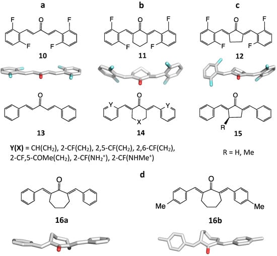 Five X-ray crystal structure geometries of selected diarylpentanoid MACs. In the structures shown, the aromatic rings are each substituted with fluorine at the ortho-postions C2 and C6 or without substituents; (a) Acyclic series exhibiting planar geometry; (b) Central 6-membered ring with an approximate plane of symmetry bisecting an envelope conformation; (c) Central 5-membered ring with a twist ring conformation; (d) 7-membered ring derivatives presenting two different conformations of the central ring.