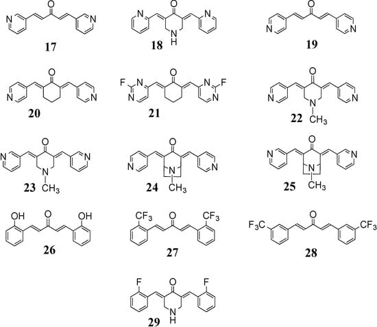 In general, the anti-inflammatory activity of curcumin analogs results primarily from inhibition of nuclear factor kappa-B (NF-κB), tumor necrosis factor (TNF)-α, and interleukin (IL)-6, NF-κB being a key transcriptional factor in the inflammatory signaling pathway. Many studies have reported that MACs may target both inflammation and tumors by inhibiting the activation of NF-κB [,,,,,,,,,,,,,,,,]. The anti-inflammatory properties and the ability to inhibit the immune response by MACs, at least in part, result from inhibition of the activation of the latter multi-protein complex, since many of the genes that are implicated in the immune/inflammatory response are upregulated by NF-κB. MACs have also been shown to be a direct inhibitor of enzymes that are important in the inflammatory response, including lipoxygenase (5-LOX) and cyclooxygenase (COX-2) []. With few exceptions, most of the curcumin analogs with good anti-inflammatory action incorporate the diarylpentanoid linker instead of the β-diketone moiety and incorporate heteroatom and halogen moieties (17–25, Figure 5). Parallel studies have also confirmed that these analogs exhibit better anti-tumor, anti-inflammatory and anti-oxidant activity relative to curcumin (17–19, 26–29, Figure 5).