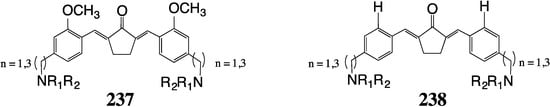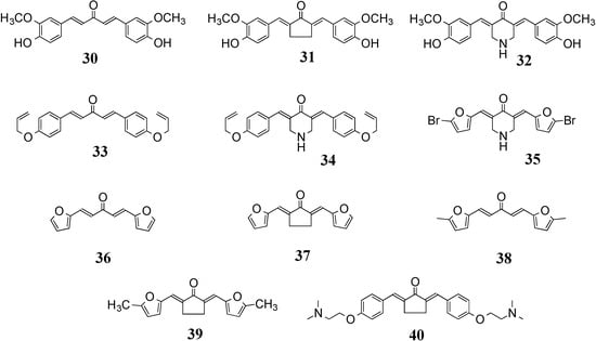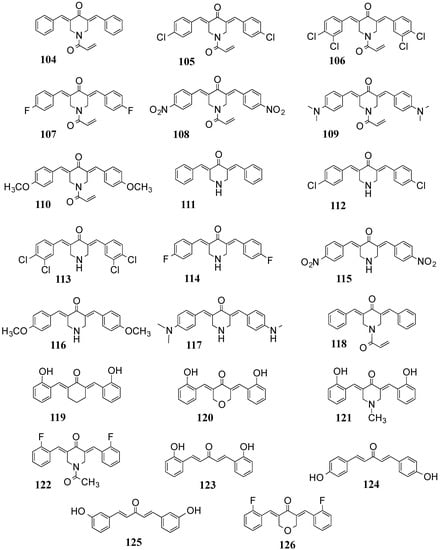 Other reasons for turning from 1 to MACs are ease of synthesis [,] selectivity [,,] and recognition that the pleiotropic nature [] of the curcumin-like architecture permits rapid evaluation of drug potential for currently troublesome disorders such as highly resistant bacteria, Alzheimer’s syndrome, HIV, tuberculosis, malaria and diabetes [,]. Several excellent reviews detailing the diversity, applications and biological foundations of MACs for utility in human disease have appeared in the recent past [,,,,,,,].