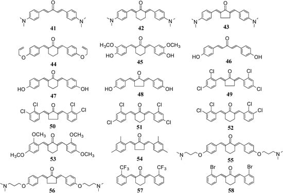 Liang et al. reported a series of MACs (30–40, Figure 6) with the ability to inhibit LPS-inducing macrophages that release inflammatory cytokines TNF-α and IL-6 via in vitro cell experiments [,]. Systematic structure-activity relationship studies on these compounds showed that multiple analogs can block expression of the inflammatory factors. Cyclohexanone-containing derivatives are somewhat more effective than acetone or cyclopentanone-derived compounds []. Installation of a long chain substituent such as 3-(dimethylamino) propoxyl (compound 40) shows an inhibitory effect on LPS-induced TNF-α expression similar to curcumin, but a more potent inhibitory effect on LPS-induced IL-6 expression than curcumin. However, the dimethylamino-analogs 41–43 (Figure 7) exhibit either similar or reduced inhibitory effects on LPS-induced TNF-α or IL-6 expression relative to curcumin, indicating that nitrogenous substitution by itself does not enhance anti-inflammatory activity. On the other hand, 33 and 44 (Figure 6 and Figure 7) with a long chain allyloxyl moiety shows a stronger inhibitory effect on LPS-induced TNF-α indicating that the length and flexibility of the distal substituents may be favorable to the anti-inflammatory activity.