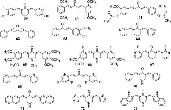 - Yadav, B.; Taurin, S.; Rosengren, R.J.; Schumacher, M.; Diederich, M.; Somers-Edgar, T.J.; Larsen, L. Synthesis and cytotoxic potential of heterocyclic cyclohexanone analogues of curcumin. Bioorg. Med. Chem. 2010, 18, 6701–6707. [Google Scholar] [CrossRef] [PubMed]