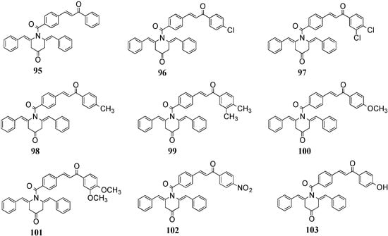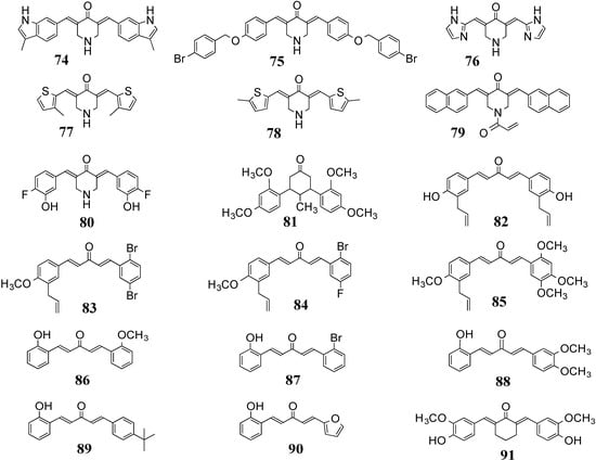 Recently, Liu et al. synthesized a series of allylated or prenylated MACs and evaluated their anti-inflammatory effects in RAW 264.7 macrophages []. A majority of the compounds effectively inhibited the LPS-induced expression of TNF-α and IL-6. The preliminary and quantitative SAR analyses showed that the asymmetric MACs possess higher anti-inflammatory activity than symmetric analogs, and suggested that the electronegativity and molecular polarizability of the MAC structures are important for the inhibition of LPS-induced IL-6 expression. Among the tested compounds, 82–85 (Figure 9) exhibited stronger inhibition of both TNF-α and IL-6 than curcumin. In particular, 83 delivered the most potent effects with inhibitory rates reaching 68% and 91%, respectively, and exhibited significant protection against LPS-induced death in both septic mice models and primary peritoneal macrophages. A related and recent report described the synthesis and evaluation of various asymmetric MACs as anti-inflammatory agents by inhibiting the LPS-induced secretion of TNF-α and IL-6. Among the test subjects, 86–90 exhibited dose-dependent inhibition. The anti-inflammatory activities of analogs 86 and 87 were associated with inhibition of the phosphorylation of the extracellular signal-regulated kinase ERK and the activation of NF-κB [].