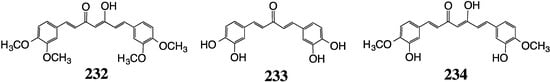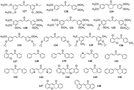 To evaluate MAC effects on colon cancer cells, Ohori et al. synthesized and screened 127–131 (Figure 13) against cell growth. The analogs are symmetrical 1,5-diarylpentadienones, the aromatic rings of which possess alkoxy substituents at meta- or meta/para-positions. Compound 128 was found to exhibit four-times higher potency than curcumin (IC50 2 µM vs. 8 µM) [].
