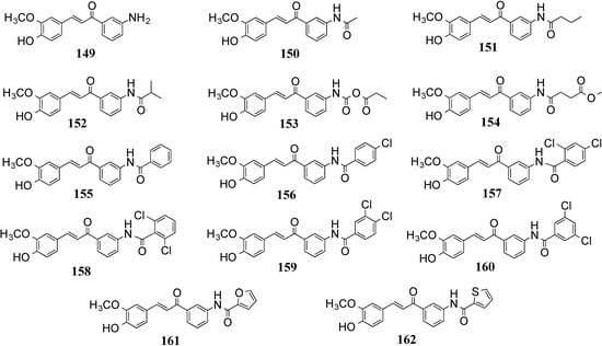 Woo et al. conceived a series of asymmetric MAC chalcones by pairing substituted phenyl amides with the terminal curcumin styrene unit carrying m-OMe and p-OH; i.e., 149–162 (Figure 14). The in vitro growth inhibition of human umbilical vein endothelial cells (HUVEC) caused by 149, 158, 161 and 162 reflects potent anti-angiogenic activity and suggests it may be particularly important for asymmetric phenyl alkyl amides coupled with heteroaromatic moieties [].