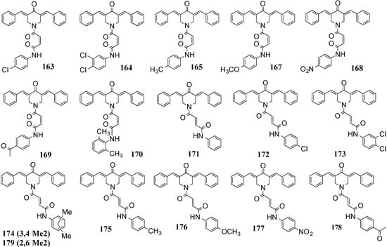 Jha et al. synthesized a series of highly polar MACs 163–179 (Figure 15) by replacing the unstable keto-enol moiety of curcumin with a substituted piperidone and testing the series against tumor inhibition activity []. In human Molt 4/C8 cells and CEM T-lymphocytes, compounds 171–179 were significantly more potent than the control agent melphalan [] in inhibiting leukemia and colon cancer cell lines. However, compounds 163–170 lost activity. The change in potency is undoubtedly due to the geometric disposition of the double-bond configuration within the (O=C)-CH=CH-(C=O) moiety of the piperidone substituent; i.e., E vs. Z stereochemistry. The most likely planar E form is expected to be twisted out of planarity in the Z isomer by steric effects encountered from the syn olefin orientation. The corresponding X-ray structures would offer deeper insights into this hypothesis, but in the spirit of the message of Figure 4, we presume that co-planarity of the compounds plays a key role in exerting cytotoxicity in the target proteins.