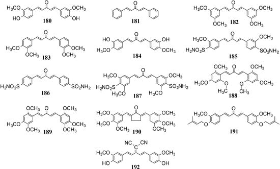 Fuchs et al. synthesized a collection of largely acyclic MACs 180–192 (Figure 16) and tested their anti-tumor properties by blocking the proliferation of prostate and breast cancer cells []. Compound 188, decorated with three methoxy groups at ortho and para terminal ring sites, is particularly attractive with an IC50 within the 10−6 M range corresponding to an inhibitory potency of more than 50-fold higher than curcumin. Suarez and colleagues prepared a similar subset of compounds 61, 180, 181, 191 and 192 (Figure 8 and Figure 16) and tested them against several tumor cell lines []. All the compounds exhibited different degrees of inhibitory activity against colon cancer cells HT-29, but analogs 61, 180 and 181 furnished superior potency (IC50 < 2.3 μM).