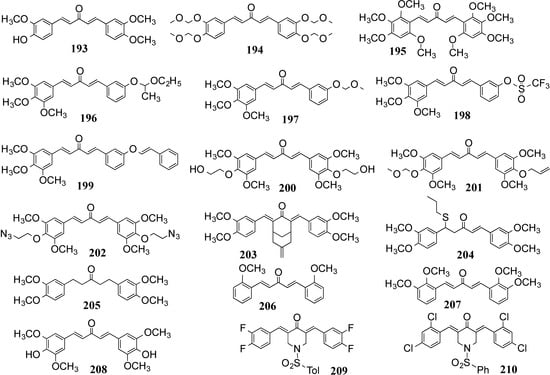 Yamakoshi et al. reported the cytotoxicity of MACs 193–205 (Figure 17) to the human colon cancer cell line HCT-116 []. SAR analysis complemented other studies by highlighting the structural motifs for bis-(arylmethylidene)acetone and 3-oxo-1,4-pentadiene and the degree of substitution as being important for maintaining high levels of cell cytotoxicity. Interestingly, the compound structures studied in this work suggests that the symmetry of the compounds is relatively insignificant for cytotoxicity. Zhang and co-workers prepared 26 asymmetric monocarbonyl analogs and demonstrated that five of them strongly inhibit the release of tumor necrosis factor-α and interleukin-6, while also showing much higher chemical stability than curcumin itself []. Thus, while the compounds are certainly suitable for use as agents against acute inflammatory disease, it remains to be seen whether the additional synthetic steps and the low-to-modest yields in some cases justifies the asymmetry. Liang’s team likewise tested a series of MACs for the anti-tumor activity and presented an SAR that implied compounds such as 206 and 207 (Figure 17) can induce tumor cell apoptosis by activating the stress mechanism of endoplasmic reticulum [,]. The two compounds have been reported to be under preclinical study for non-small cell lung cancer.