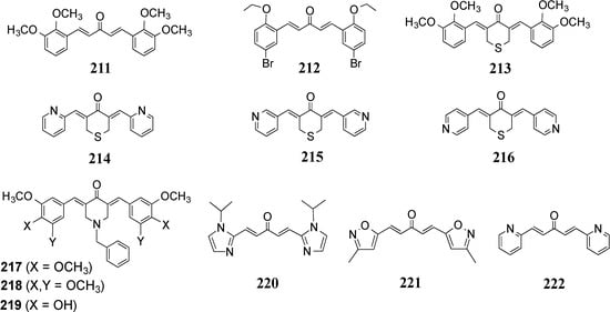 A Guangzhou-New Jersey collaboration has reported in vitro activity for two series of analogs, the thiopyran-4-ones 213–216 [,] and the benzyl piperidones 217–219 [] (Figure 18). The thiopyranones were tested in an MTT proliferation assay against prostate PC-3, HT-29 colon and Panc-1 cancer cell lines and shown to deliver suppressive IC50 values < 1 μM. All block transcriptional activity of NF-κB, modulate phosphorylation of ERK1/2 and reveal potent stimulation of apoptosis. The compounds are also uniformly 10–40 fold superior to curcumin in growth inhibition assays. In the parallel study with the benzyl piperidones 217–219, PC-3, pancreas BxPC-2, HT-29, and H1299 lung cancer cell lines were probed with growth inhibition, MTT and trypan blue exclusion assays. The compounds are active with IC50 values < 2 μM and, similar to the thiopyranones, cause apoptosis in PC-3 cells by reduction of phosphorylation of ERK1/2 and AKT. Utilization of the benzyl moiety as a linker, the introduction of F and OCH3 substitution on the benzyl aromatic ring and increase of steric bulk appears to enhance the cytotoxicity. A final investigation by Samaan et al. [] presented a 32-compound series of nitrogen-containing heterocyclic derivatives represented by 220–222 (Figure 18) as a challenge against the h-androgen independent prostate cancer cell lines PC-3 and DU-145. The analogs are reported to furnish anti-prostate cytotoxicity IC50 values of 50–390 nM, but no toxicity against MCF-10A normal mammary epithelial cells. The terminal 5-membered ring heterocyclic molecular class (220–221) would appear to serve as an effective bio-isostere of the now well-recognized potency and solubility enhancing pyridine series (222 and others).