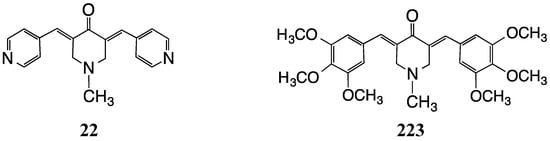 Finally, two piperidines 22 (Figure 5) and 223 (Figure 19) assayed by Yadav and colleagues display the well-known inhibition of NF-κB activation complemented by substantial cytotoxicity towards MBA-MB-231, MDA-MB-468 and SkBr3 breast cancer cell lines; models for triple negative breast cancer disease []. Against the MBA-MB-231 cell line, the EC50 values are submicromolar at 0.8 and 0.3, respectively, while the two agents also cause apoptosis in 40%–45% of the SKBr3 and MDA-MB-231 cells, respectively.