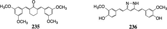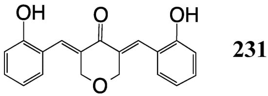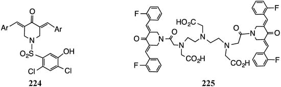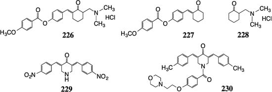 The second study prepared 15 piperidones and screened them against Salmonella typhi, Vibrio cholerea, Escherichia coli and Staphylococcus aureus [] Several compounds produced significant zones of inhibition (e.g., 224, Figure 20) for the first two bacteria superior to the action of both curcumin and penicillin. More modest activity was observed for the other analogs against all four bacteria.