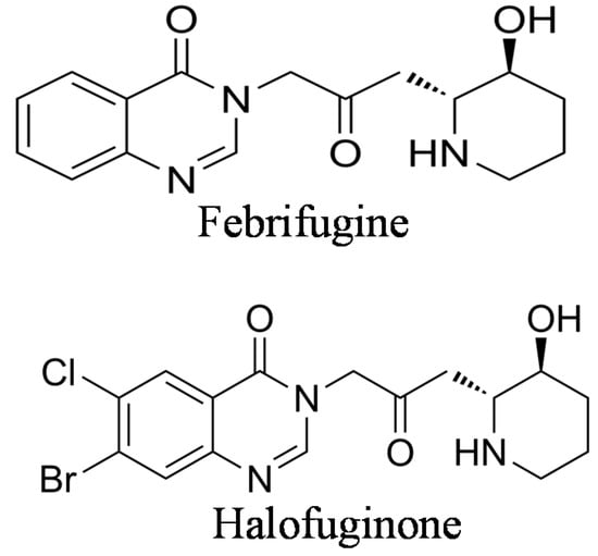 - McLaughlin, N.P.; Evans, P.; Pines, M. The chemistry and biology of febrifugine and halofuginone. Bioorg. Med. Chem. 2014, 22, 1993–2004. [Google Scholar] [CrossRef] [PubMed]