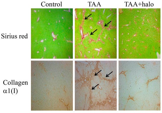 - Spira, G.; Mawasi, N.; Paizi, M.; Anbinder, N.; Genina, O.; Alexiev, R.; Pines, M. Halofuginone, a collagen type I inhibitor improves liver regeneration in cirrhotic rats. J. Hepatol. 2002, 37, 331–339. [Google Scholar] [CrossRef] [PubMed]