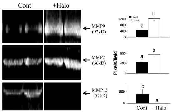 Effect of halofuginone on MMPs activity. Pancreatic tumors were established in Athymic-Nude (CD1 nu/nu) mice by implanting subcutaneously 106 Panc2 human pancreatic tumor cells. Halofuginone was injected intraperitoneal (IP) 3 times a week starting one week after tumor cells implantation. Tumors (300 mg) were taken for MMPs activity analysis by zymography. Increase in MMP9 and MMP2 and decrease in MMP13 were observed in the tumors of halofuginone-treated mice compare to the untreated mice. Each column represents 15 sections of 5 different tumors and represents as the means ± SE according to Duncan’s multiple-range test. Columns with different letters differ significantly (p < 0.05).