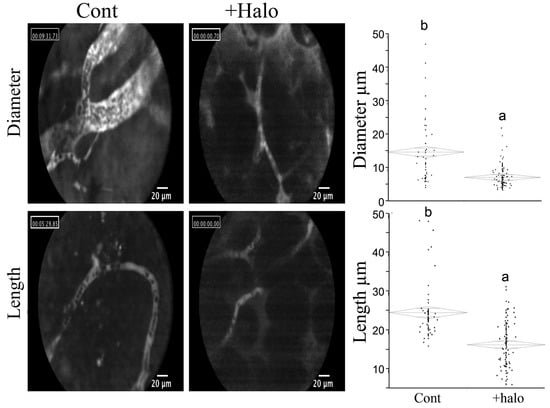 Effect of halofuginone on blood vessels within pancreatic tumor xenografts. Pancreatic tumors were established in Athymic-Nude (CD1 nu/nu) mice by implanting subcutaneously 106 Panc2 human pancreatic tumor cells. Halofuginone was injected intraperitoneal (IP) 3 times a week starting one week after tumor cells implantation. When tumors volume reached 200 cm3, Fluorescein isothiocyanate-dextran (FITC-Dextran) was injected via the tail vein and blood vessels diameter and length were visualized by confocal microscopy. The results are of at least 70 blood vessels from different tumors. Columns with different letters differ significantly (p < 0.05). Note the decrease in both blood vessel diameter and length in the halofuginone-treated mice.