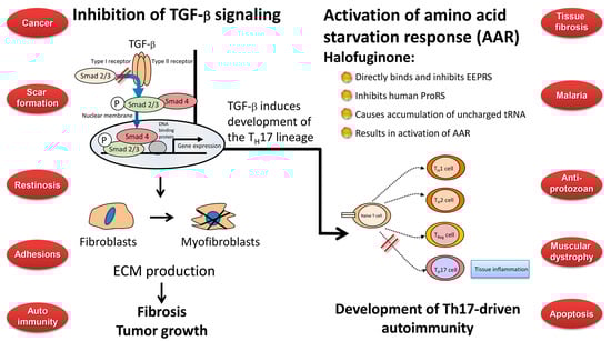 A major question that needs to be answered is whether all the described biological activities—and perhaps others, as yet unknown—of halofuginone should be attributed to a single mode of action or to multiple pathways. The two described modes of action known so far are inhibition of fibrosis and of fibroblasts-to myofibroblasts transition by inhibition of Smad3 phosphorylation down-stream of the TGFβ signaling pathway [,], and inhibition of Th17 differentiation, resulting in inhibition of the inflammation and autoimmune reaction by activation of the AAR response by binding to prolyl-tRNA synthetase [,,]. The TGFβ pathway may represent at least one possible link between the two pathways. In mice Th17 differentiation requires initiation by TGFβ and IL-6, expansion by IL-21, and stabilization by IL-23 []. In humans, the combination of TGFβ and IL-21 was sufficient to induce differentiation in naïve T cells. There are at least two functional subclasses of Th17 cells, distinguished by their development in the presence or absence of TGFβ; also, some Th17 cells can produce their own TGFβ []. TGFβ [] and latent TGFβ complexes on cell surfaces are involved in Th17 cell differentiation []. The effect of TGFβ on Th17 cell differentiation was concentration-dependent [], and probably involved the TGFβ–Smad regulatory network []. Moreover, myofibroblasts isolated from gastric cancer induced Th17 cell differentiation when co-cultured with CD4+ T cells to a greater extent than normal myofibroblasts [], and halofuginone prevented cutaneous GvHD [] and concanavalin A-induced liver fibrosis by affecting Th17 cell differentiation [] which suggests a direct link between the myofibroblasts/fibrosis pathway and the Th17 pro-inflammatory pathway, both of which are required for tumor development. In contrast, both TGFβ-independent and -dependent pathways of Th17 differentiation were described [], and no TGFβ was required for induction of Th17-dependent experimental autoimmune encephalomyelitis []. The inflammation and fibrosis that follow infections with plasmodium [,], parasites [], chronic active hepatitis B and C [], and HIV-1 [] destroyed the tissue microenvironment and impaired tissue/organ functions that then could no longer support the normal resident cell population, including CD4+ T cells. Halofuginone treatment that prevents the inflammation and fibrosis processes preserves the tissue architecture intact and enables it to combat the pathogenesis. Furthermore, tumor cells develop and metastasize more efficaciously in a fibrotic tissue [,], therefore any reduction in tissue fibrosis will reduce the risk of cancer (Figure 5).