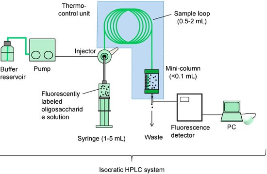 where Bt is the effective ligand content (expressed in mol) of a lectin-immobilized column, V and V0 are elution front volumes of analyte and a control substance, respectively, and [A]0 is the initial concentration of the analyte (e.g., PA-glycans). Bt should be obtained from another set of experiments under the umbrella of “concentration-dependence analysis” (see, Section 3.3). A recently developed automated system (FAC-1) is equipped with a pair of capsule-type miniature columns (each 2.0 mm in diameter and 10 mm in length, with a bed volume of 31.4 μL) in line with a fluorescence detector (Shimadzu RF10AXL: for details, see [40,41]). Manual operation is also possible if a standard isocratic HPLC system is available (see Figure 3 for basic production of a FAC system), while a large sample loop (e.g., 2 mL) relative to column size (e.g., 0.1 mL) should be used. For this purpose, the use of commercially available gourd columns (4.0 mm in diameter and 10 mm in length, bed volume 125.6 μL) is recommended [37]. Typical conditions in the automated FAC-1 system are as follows: analytical speed, 5 min/analysis; sample requirement, 0.3–1.0 mL of PA-glycan solution (5–10 nM); resolution (experimental error), 3–5 μL in V–V0. In most cases, Kd values for lectins and glycans (10−3 to 10−7 M) are much larger than [A]0 (5–10−9 M), meaning that Equation (1) can be simplified to:
