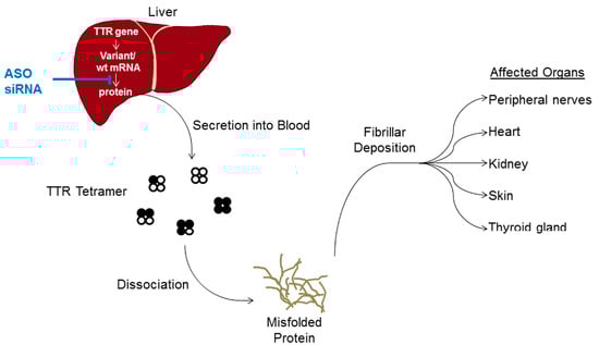 - Benson, M.D.; Kluve-Beckerman, B.; Zeldenrust, S.R.; Siesky, A.M.; Bodenmiller, D.M.; Showalter, A.D.; Sloop, K.W. Targeted suppression of an amyloidogenic transthyretin with antisense oligonucleotides. Muscle Nerve 2006, 33, 609–618. [Google Scholar] [CrossRef] [PubMed]