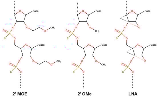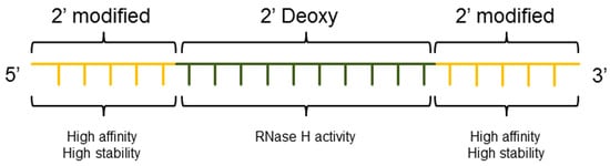 The development of chimeric ASO sequences called “gapmer” having a central phosphorothioate region of 8–12 deoxynucleotides responsible for binding of RNase H and flanked by 2′-alkyl-modified nucleotides on both sides to increase stability (Figure 4), was essential for further improvement of therapeutic oligonucleotides [84]. Currently, most advanced therapeutic ASO platforms in the clinic contain a nucleotide modification of 2–5 bases on both ends of the oligonucleotide that have excellent stability and allow efficient RNase H cleavage. Modification of nucleotides have also been used to develop dsASO where the sense strand is chemically modified in a way that it is more susceptible to hydrolysis by phosphodiesterases leaving the stable antisense gapmer for inhibition [85]. Besides the molecular impact of the most advanced ASO platforms for gene silencing, off-target effects exerted by the oligonucleotide have to be considered. Off-target effects can result in significant toxicity and frequently associate with the class of nucleotide modifications rather than with a specific sequence. Broadly, hybridization-dependent, e.g., due to binding at off-target RNA, or hybridization-independent, e.g., cytoplasmic granule accumulation or pro-inflammatory effects, can be distinguished [86].