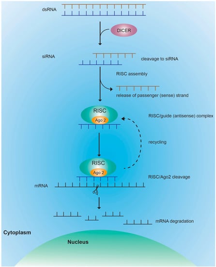 Short dsRNA are classified as small interfering RNA (siRNA) and micro RNA (miRNA). A variety of RNA structures can be used to induce RNAi, including Dicer substrate RNAs or shorter siRNAs. In mammalian cells, siRNA is generated by cleavage of long dsRNA into smaller RNA molecules of ~20–30 bp in length (Figure 5) [98,99]. Dicer, a large, multidomain RNase III endonuclease enzyme, complexed with the TAR-RNA binding protein (TRBP), is responsible for this cleavage [100]. The resulting siRNA has a 5′ phosphate and a two-nucleotide overhang at the 3′ end [101]. This unique characteristics allow recognization by the enzymatic complex termed RNA-induced silencing complex (RISC). The ~670 kDa RISC complex is composed of Argonaute 2 (Ago 2), Dicer, and TRBP [102]. Each siRNA duplex consists of a guide (antisense) strand and a passenger (sense) strand. The strand with the lowest duplex stability at the 5′ end (guide strand) is incorporated into RISC [103]. Unwinding and release of the passenger strand is accomplished by Ago 2, which forms the catalytic core of the RISC complex [104,105]. RISC uses the guide RNA to locate the complementary RNA sequence leading to endonucleolytic cleavage of target mRNA by Ago 2. In contrast to ASO, there is predominantly one cleavage event that takes place at the nucleotide position 10 upstream of the siRNA 5′ end [106]. The mechanism by which RISC finds the target mRNA is not completely understood. The accessibility of the target mRNA (e.g., by absence of secondary and tertiary structures) directly correlates to cleavage efficacy [107]. The guide RNA/protein complex is a multiple turnover enzyme and is recycled after cleavage allowing the initiation of an enzymatic cascade. Only one or few RNA molecules within the target cell are sufficient for cleavage which explains the remarkable efficiency of RNAi-mediated silencing [108,109]. Continuous inhibition of target mRNA has been observed in non-dividing cells, such as hepatocytes, for a period of 3–4 weeks on siRNA application [110]. Of note, for the liver it has been suggested that siRNA can be exchanged between cells, partially mediated by shuttling of exosomes, even without direct cell-cell contact which may further potentiate the efficacy [111]. The RNA loading and activity of the siRNA mechanism typically takes place in the cytoplasm; however, a nuclear localization of several siRNA components has recently blurred this view [112].