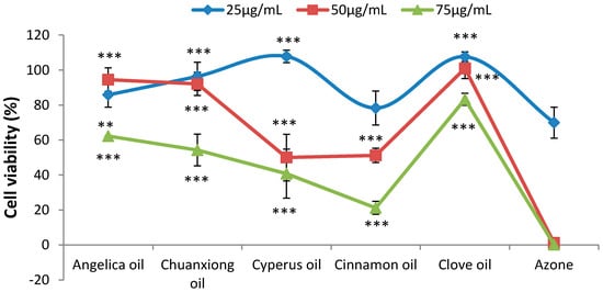 - Sample Availability: Samples of the EOs (Angelica oil, Chuanxiong oil, Cyperus oil, Cinnamon oil and Clove oil) are available from the authors.