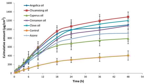 Among NSAID drugs, it was found that ibuprofen showed the poorest bioavailability. Following transdermal administration to rats, the area under the plasma–time curve (AUC) values of piroxicam, ketoprofen, naproxen, indomethacin and ibuprofen were determined to be 527.00, 269.45, 258.64, 243.22 and 88.08 μg/mL·h, respectively [13]. Therefore, it is indispensable to employ PE to increase the skin permeation of ibuprofen in order to maintain an effective blood level. Among the five EOs, only Clove oil had been evaluated as PE for TDD of ibuprofen hydrogel and the AUC values was increased by 2.4 times compared to the control [21]. In the present study, five analgesic EOs were compared as PE. Compared to the control (ibuprofen only), the ER values of ibuprofen in vitro were measured to be 3.35, 3.57, 2.26, 2.80, 3.07 and 2.55 using Angelica oil, Chuanxiong oil, Cyperus oil, Cinnamon oil, Clove oil and Azone as PE, respectively. As PE, EOs act mainly by disruption of the highly ordered structure of SC lipid with an increase in intercellular diffusivity [22]. And the intercellular spaces are the preferential pathway for lipophilic ibuprofen to penetrate through the SC.