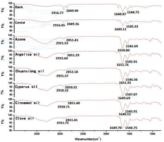 To elucidate the effect of EOs on the intercellular lipids in the SC, ATR-FTIR stretching peaks near 2850 cm-1 (C-H symmetric stretching absorbance frequency peak), 2920 cm−1 (C-H asymmetric stretching absorbance frequency peak), 1650 (Amide I) and 1540 (Amide II) were measured after the application of EOs to skin (Figure 3). The shift of a higher frequency occurs when the CH2 groups along the alkyl chain of lipids change from trans to gauche conformation, suggesting that the SC lipid is disturbed [23]. Peaks near 2920 cm−1 and 2850 cm−1, for asymmetric and symmetric stretching, respectively, showed that treatment of rat skin with the solvent (PG:IPA = 30:70 (v/v)) alone did not result in an obvious shift in stretching frequencies compared with untreated skin. In contrast, in skin treated with EOs or Azone, shifts were observed to CH2 symmetric and asymmetric stretching frequencies which were approximately 0.4 to 6.8 cm−1 higher than those observed with no treatment (blank) or with solvent alone (control). The peaks obtained near 2850 and 2920 cm−1 correspond to asymmetric and symmetric stretching modes, respectively, of the terminal methylene groups of the lipids, and these provided specific information about the interior composition of the lipid bilayer. The trans/gauche ratio of the alkyl tails affect the frequencies of the FTIR bands. A change in the band position from trans to gauche conformation indicates fluidization of the lipid bilayer. The magnitude of blue shift in the peak position of the asymmetric and symmetric stretching vibration absorbance is correlated with an increase number of gauche conformers in the lipid acyl chain. The higher the shifts, the higher the ratio of gauche to trans [24]. In summary, the results of ATR-FTIR studies revealed that EOs acted mainly by disruption of the highly ordered structure of SC lipid with an increase in intercellular diffusivity, which helped lipophilic ibuprofen to penetrate through the SC. In addition, according to the change in peak position of amide I or II, the five EOs also appeared to have a little effect on keratin, especially Chuanxiong oil and Angelica oil.