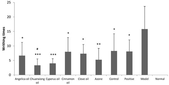Inhibitory effects of ibuprofen (140 mg/kg/d) with different EOs on dysmenorrheal model mice’s writhing times (n = 8). Positive: oral administration of 56 mg/kg/d ibuprofen suspension. Control: transdermal administration of ibuprofen hydrogel without PE. * p < 0.05, ** p < 0.01, *** p < 0.001 vs. the model group. # p < 0.05 vs. the control group.