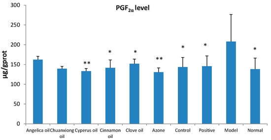 As shown in Figure 5, in primary dysmenorrheal model mice, the contents of Ca2+ and PGF2α in uterus tissue homogenate were significantly increased (p < 0.05) and the level of NO was remarkably decreased (p < 0.05). The addition of EOs, especially Chuanxiong oil, could reduce the contents of Ca2+ and PGF2α and increase the level of NO in uterus tissue homogenate.