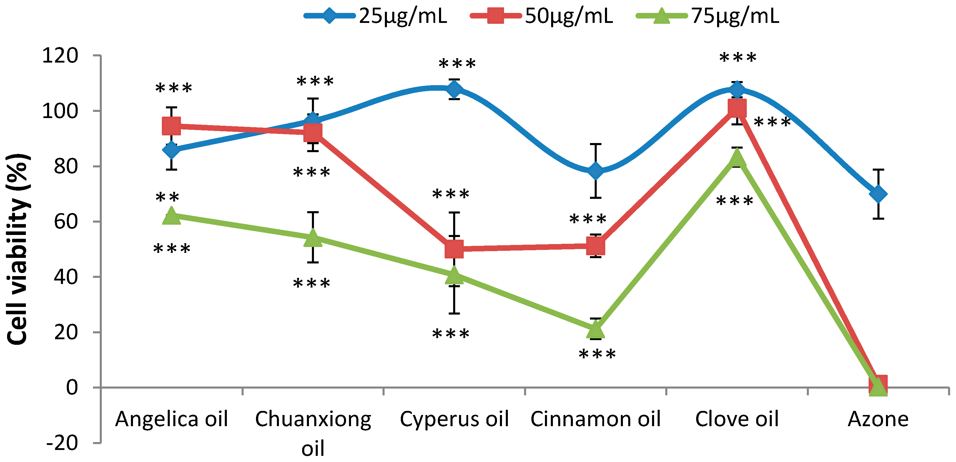 | Angelica oil | 48.88 ± 8.92 *** | 3.35 | 1102.57 ± 94.58 *** | 57.70 |
