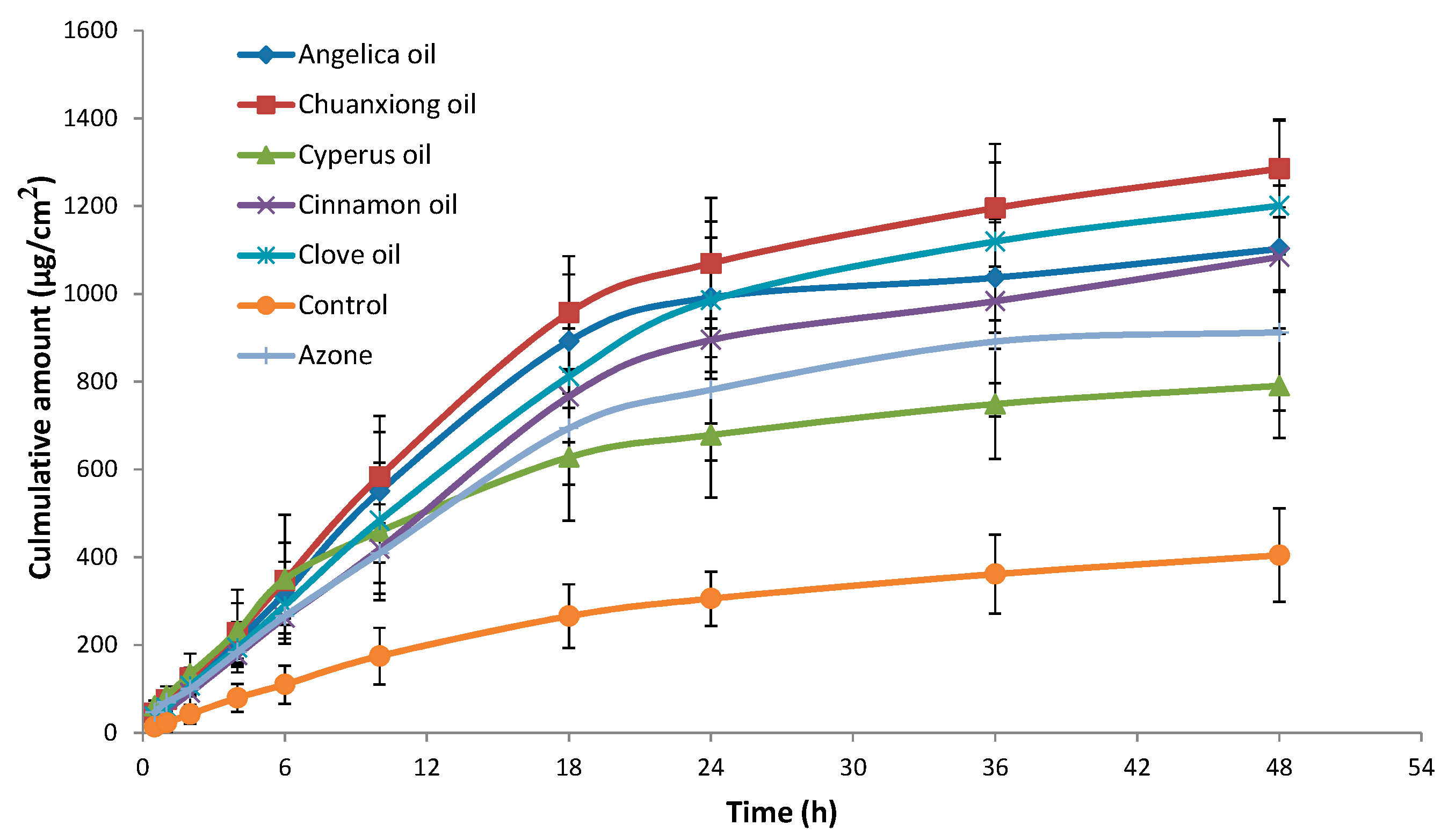 2/h). Furthermore, except Cyperus oil, the ER values of EOs were all higher than that of Azone, especially Chuanxiong oil.