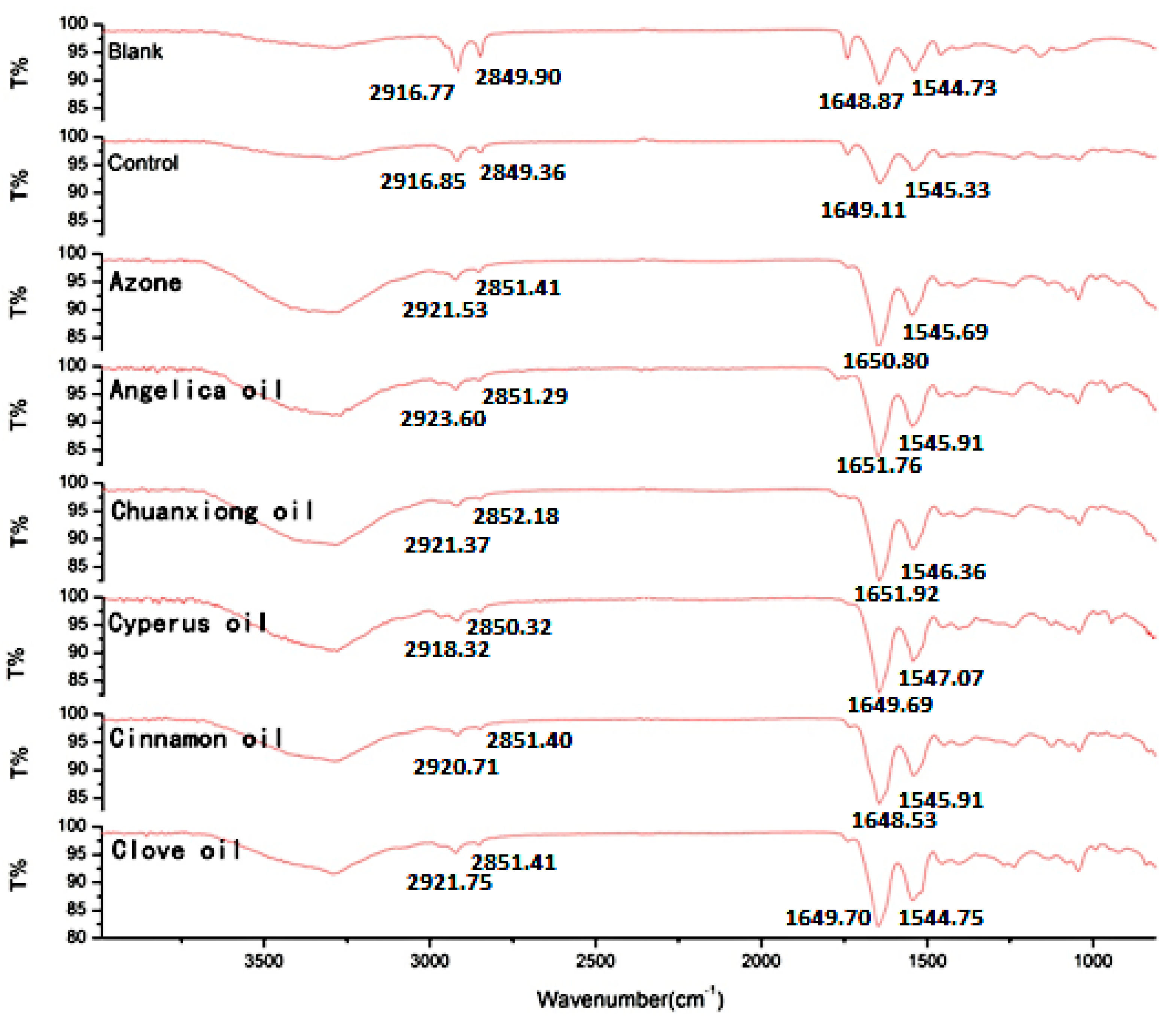 24]. In summary, the results of ATR-FTIR studies revealed that EOs acted mainly by disruption of the highly ordered structure of SC lipid with an increase in intercellular diffusivity, which helped lipophilic ibuprofen to penetrate through the SC. In addition, according to the change in peak position of amide I or II, the five EOs also appeared to have a little effect on keratin, especially Chuanxiong oil and Angelica oil.