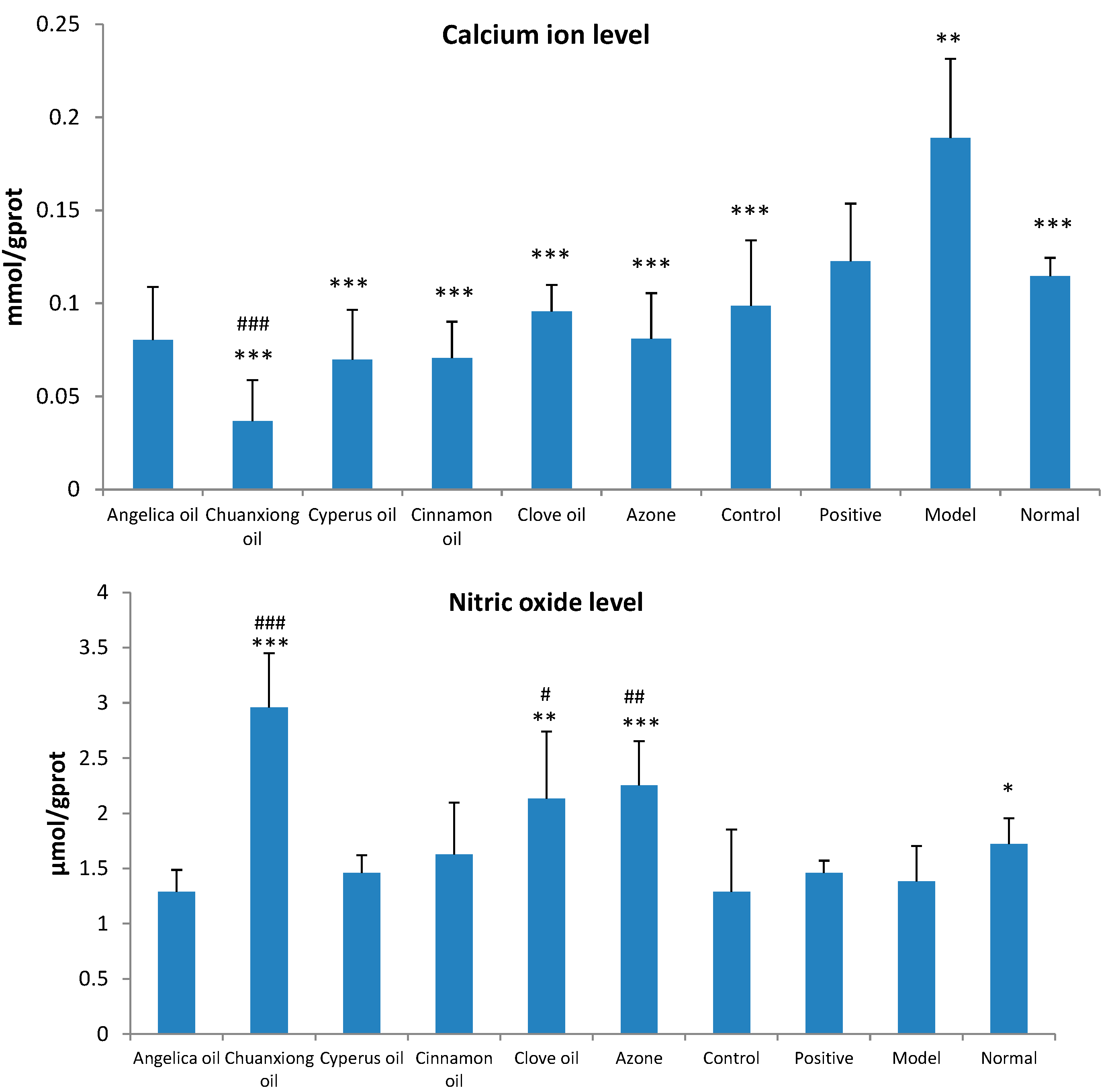 | Chuanxiong oil | 52.05 ± 7.83 ***,# | 3.57 | 1285.15 ± 109.92 ***,# # | 67.26 |