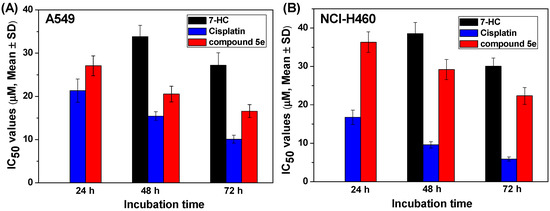 Antiproliferative effects of compound 5e on NSCLC cell lines. (A) A549 and (B) NCI-H460 cells were treated with 7-HC, cisplatin, and 5e for the indicated time (24, 48, and 72 h), respectively. After treatment, cell viability was measured by MTT assay, then inhibition rate and IC50 values were obtained. In the figure, the antiproliferative activity data of 7-HC after the incubation with A549 and NCI-H460 cell lines for 24 h were omitted because the IC50 values were over 60 μM under this condition.