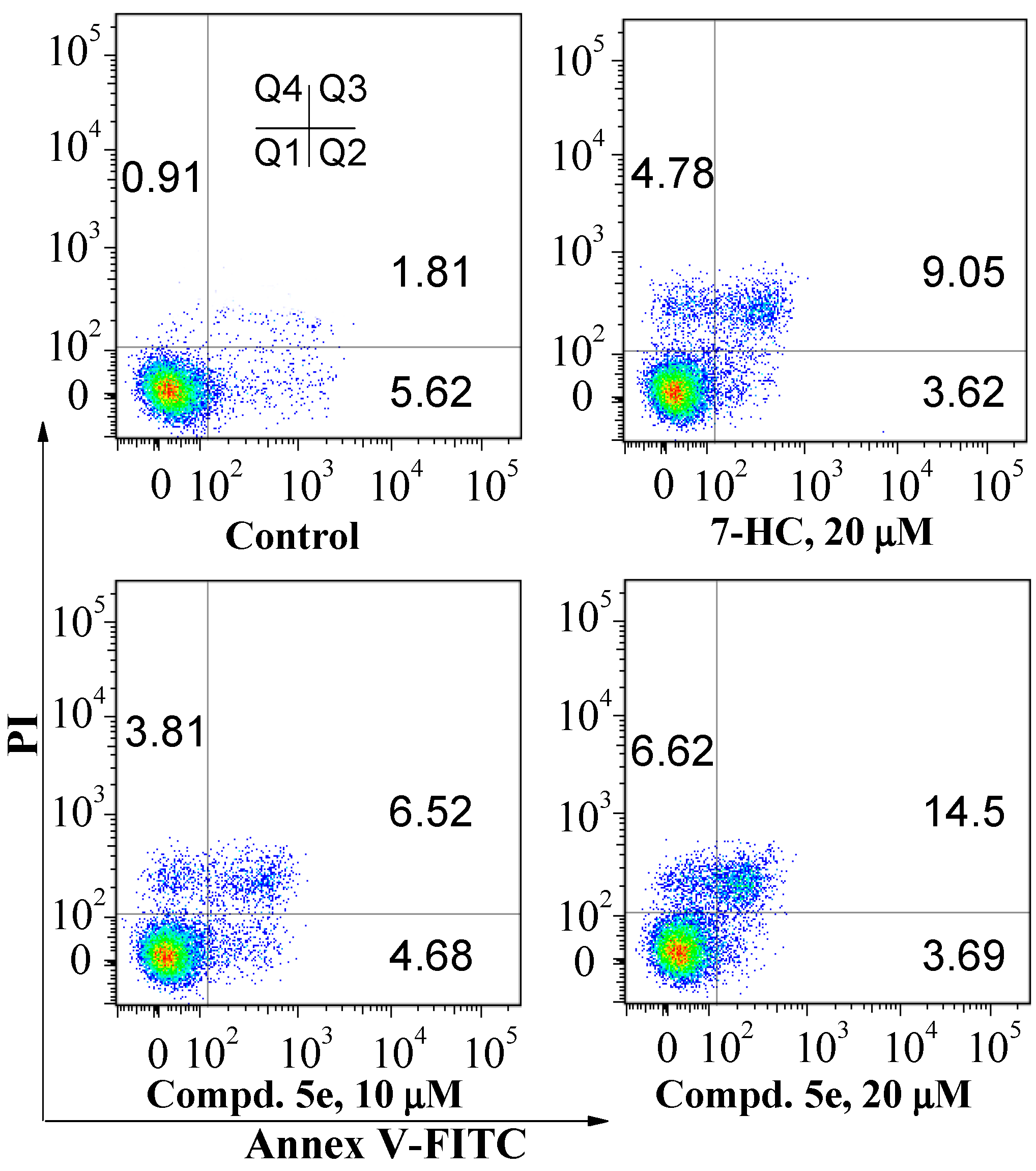 Effects of compound 5e on the induction of apoptosis in A549 cells after the co-incubation for 72 h. The population of apoptotic cells was determined by flow cytometry. The experiment was repeated thrice. Here only representative flow cytometric graphs are shown.