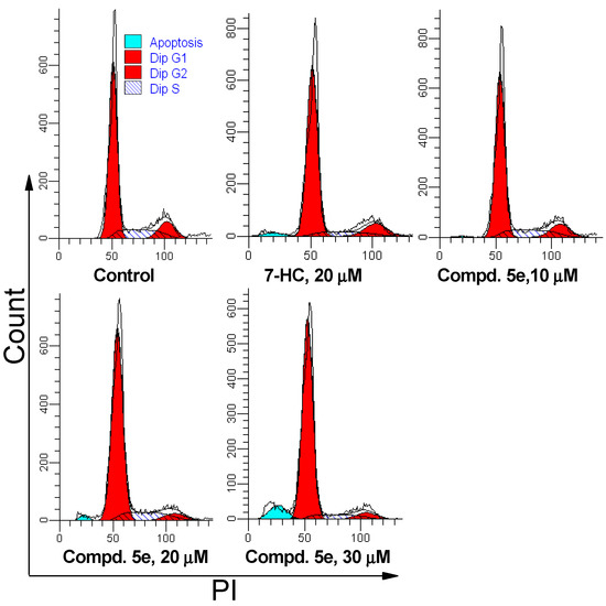 a A549 cells were treated with compound 5e or 7-HC for 72 h, then DNA content was analyzed through PI staining. Flow cytometry data were analyzed using the ModFit software. The results are presented as the means ± SD of three independent experiments; * p < 0.05 vs. the percentage of cells in G0/G1 phase of the control.