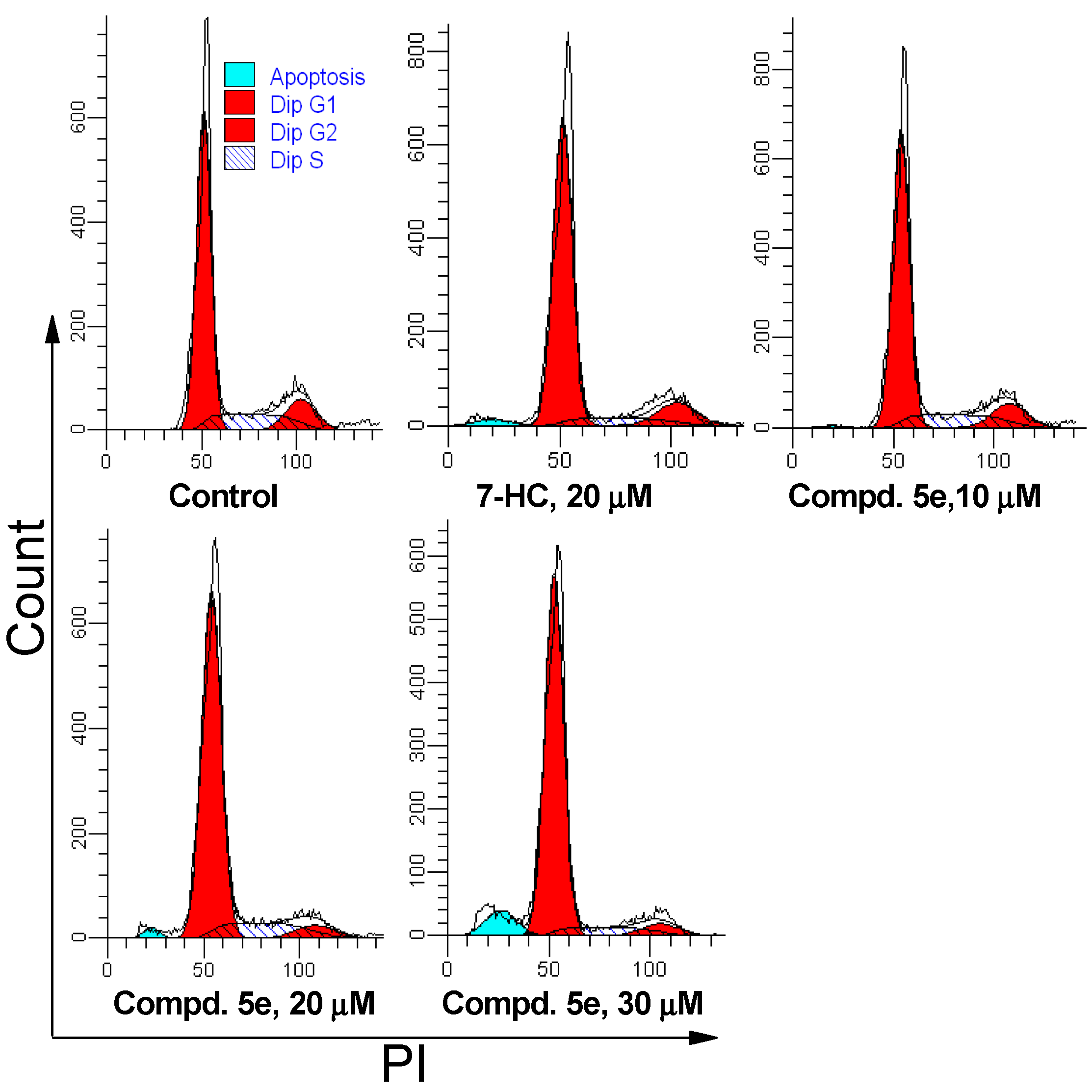 Effects of compound 5e on A549 cell cycle progression. A549 cells were treated with 5e for 72 h and analyzed by flow cytometry. The experiment was repeated thrice. Here only representative flow cytometric graphs are shown.