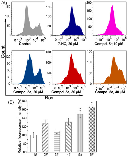 Effects of compound 5e on the intracellular ROS level in A549 cells. (A) ROS level analysis using flow cytometry; (B) Quantitative analysis of relative fluorescence intensity (% of control) using a luminescence spectrometer. A549 cells were treated with 5e for 48 h and stained with 2′,7′-dichlorodihydrofluorescein diacetate (DCFH-DA) before monitoring ROS level. Notes of Figure 4B, 1#: Control; 2#: 7-HC (20 µM); 3#: 5e (10 µM); 4#: 5e (20 µM); 5#: 5e (30 µM); 6#: 5e (40 µM). Each bar represents the mean ± SD of three independent experiments; * p < 0.05 vs. control.