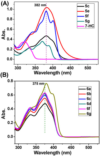 The absorption spectra of several representative compounds. (A) Compounds 5c, 5e, 5f, 5g, 7-HC; (B) Compounds 6a, 6b, 6c, 6d, 6f, 6g. The above compounds (final concentration: 50 μM) were dissolved in 1,2-dichloroethane.