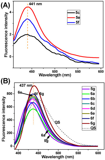 The emission spectra of several representative compounds. (A) Compounds 5c, 5e, 5f; (B) Compounds 5g, 6a, 6b, 6c, 6d, 6e, 6f, 6g. The above compounds (final concentration: 5 μM) were dissolved in 1,2-dichloroethane (λex = 360 nm).