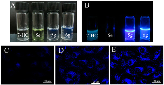 After this, the application of the synthesized target compounds for living cell imaging was investigated. 7-HC, 5e, 5g, and 6g were selected as representative examples. Compounds 5g and 6g, dissolved in 1,2-dichloroethane and exposed to visible light, exhibited conspicuous blue fluorescence. However, almost no fluorescence was observed for 7-HC and 5e under the same conditions (Figure 7A). The former two emitted very strong fluorescence once they were exposed to ultraviolet light for a few seconds (Figure 7B). Living cells images were monitored with a confocal laser scanning microscope (CLSM) after treatment with the above compounds (Figure 7C–E). Emissions of 430–450 nm were collected when a laser at 360 nm was used as excitation. The cytoplasmic was selectively dyed (blue) by 5g and 6g; the nucleus was undyed (clear). Moreover, at the same concentration of 20 μM, intracellular fluorescence intensities: 6g > 5g > 7-HC. The cells stained with 7-HC released very weak fluorescence maybe due to its very low Φf, which was consistent with the previous report [28]. Photophysical studies reveal that at least compounds 5g and 6g with very low cytotoxicity are potential fluorescent probes for biological imaging in living cells.