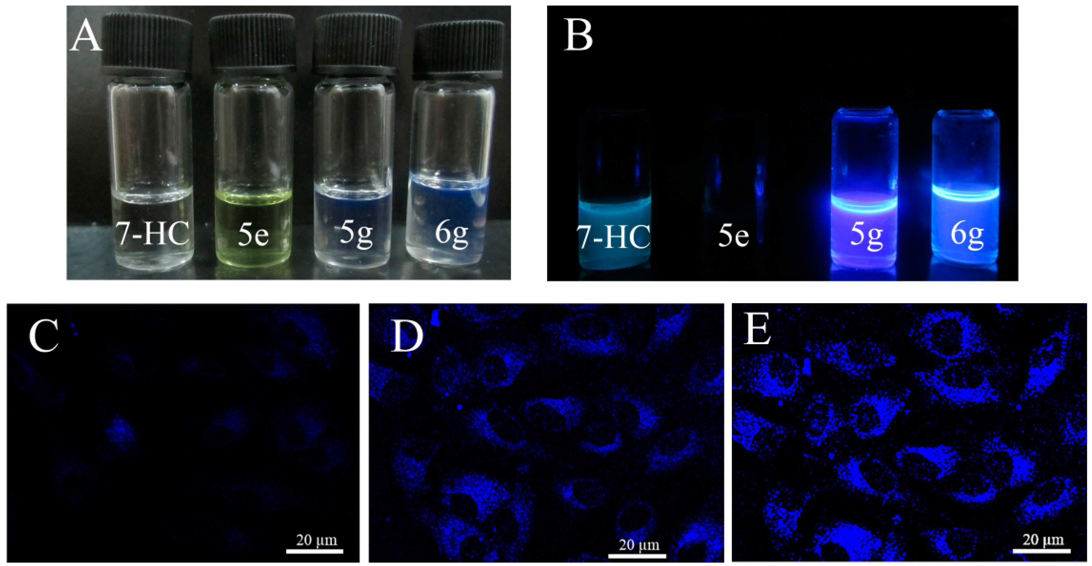 Fluorescence and living cell imaging of representative compounds. (A) Color responses to visible light; (B) Fluorescence responses after excitation at 365 nm using an UV lamp; (C–E) CLSM images after A549 cells were treated with 20 μM of 7-HC, 5g, and 6g for 30 min, respectively.