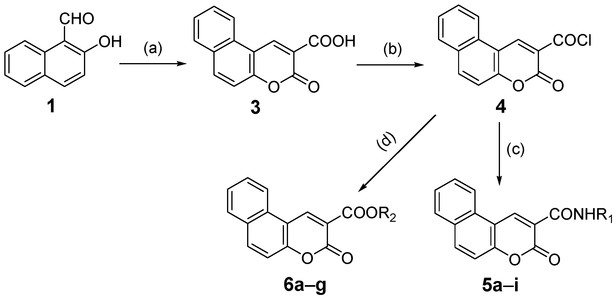 Synthetic route to the target compounds 3-oxo-3H-benzo[f]chromene-2-carboxylic acid derivatives 5a–i and 6a–g. Reagents and conditions: (a) Meldrum’s acid (2), ethanol, pyridine, 80 °C, 4 h; (b) SOCl2, 1,2-dichloroethane, 60–70 °C, 4 h; (c) R1-NH2, triethylamine, CH2Cl2, room temperature (r.t.), 10–30 min; (d) R2-OH, triethylamine, CH2Cl2, r.t., 10–30 min.