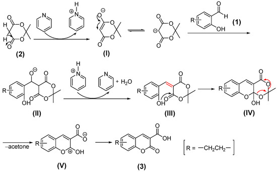 Proposed mechanism of the pyridine-catalyzed Knoevenagel condensation for synthesizing 3-oxo-3H-benzo[f]chromene-2-carboxylic acid (3).
