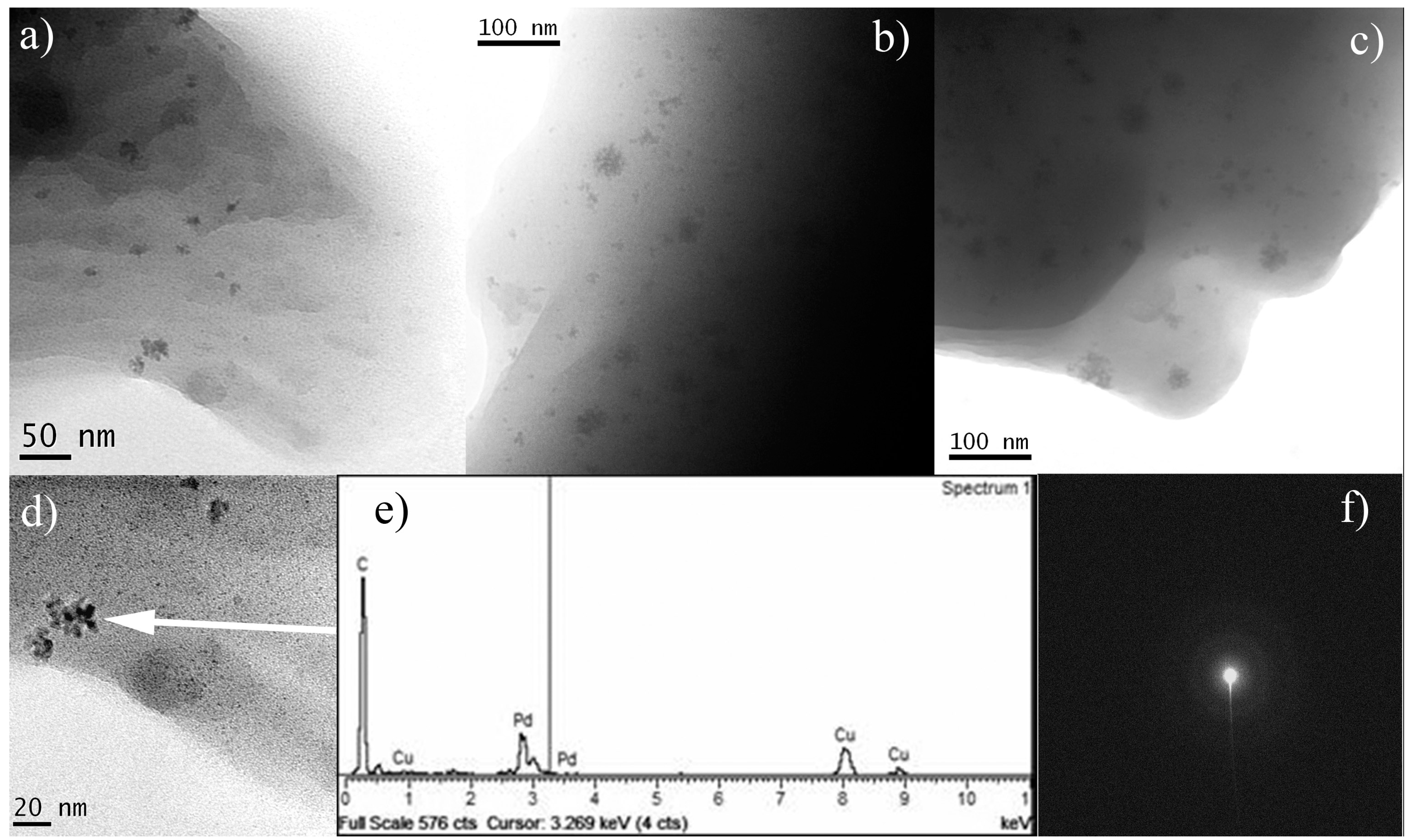 TEM images of three different batches of Pd-pol pre-catalyst showing the morphological structure are reported in Figure 2a–c. At high magnification, all pristine catalysts showed almost the same microstructure consisting of a small number of round irregular polyhedral metallic Pd primary particles of ca. 9 nm, gathered in small aggregates with a maximum diameter of 18–25 nm and embedded in the polymeric matrix. This confirms the reproducibility of the pre-catalyst microstructure after preparation by a thermal polymerization process. The elemental identity of the nanoparticles was determined by means of Energy Dispersive Spectroscopy (EDS) and Selected Area Electron Diffraction (SAED) analyses. SAED image apparently consists of a ring pattern due to the diffraction of the thin metallic Pd-crystallites.