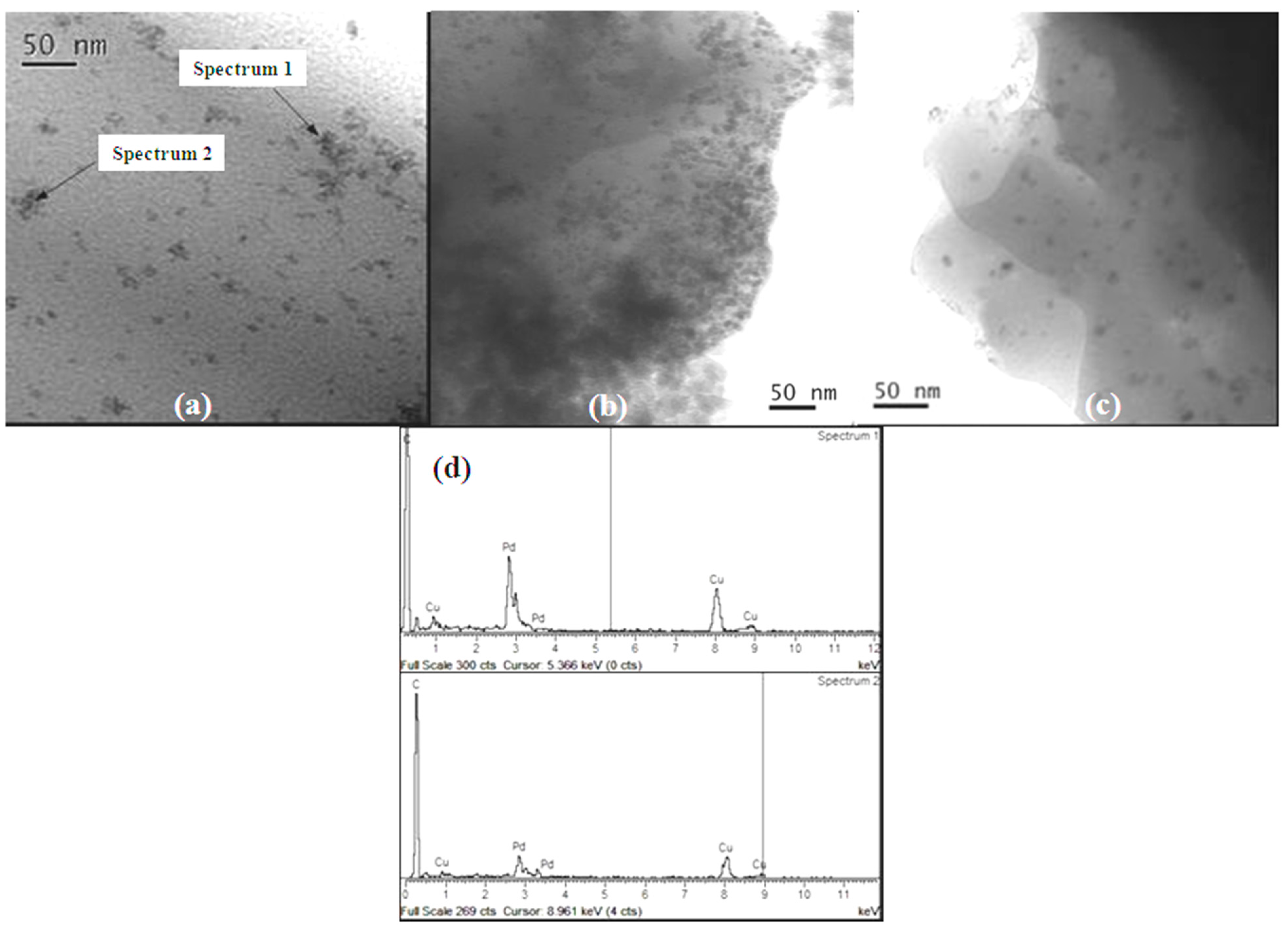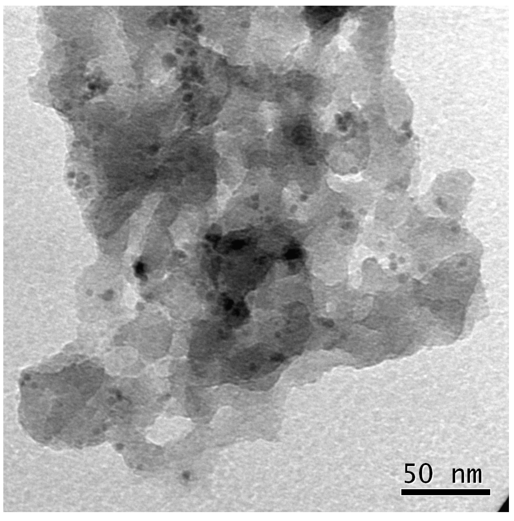 The microstructure of the polymeric matrix embedded NPs was determined by TEM observations at acceleration voltage of 200 kV (Model JEM 2010, Jeol, Akishima, Tokyo, Japan), equipped with X-ray energy dispersive spectroscopy (EDS, Plano, TX, USA). The samples were prepared by dispersing the powders in distilled water using an ultrasonic stirrer and then placing a drop of suspension on a copper grid covered with a transparent polymer film, followed by drying and carbon coating. The particle size distributions were obtained by TEM image analysis using the ImageJ software [72]. Each morphology observation was accompanied by EDS analyses that confirmed the presence of Pd. Micro-FTIR spectra (neat) were recorded using a PerkinElmer Spectrum 2000 instrument.