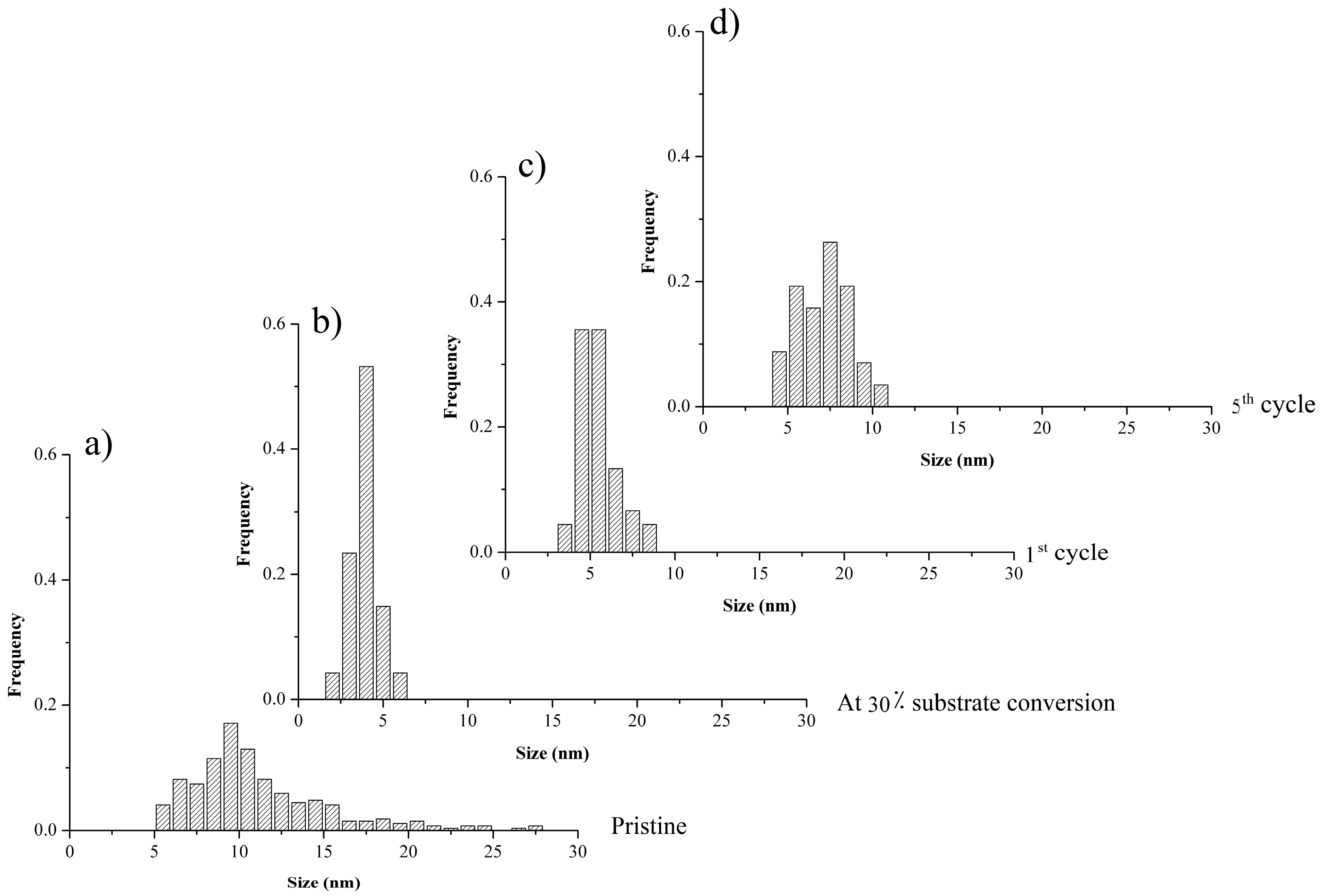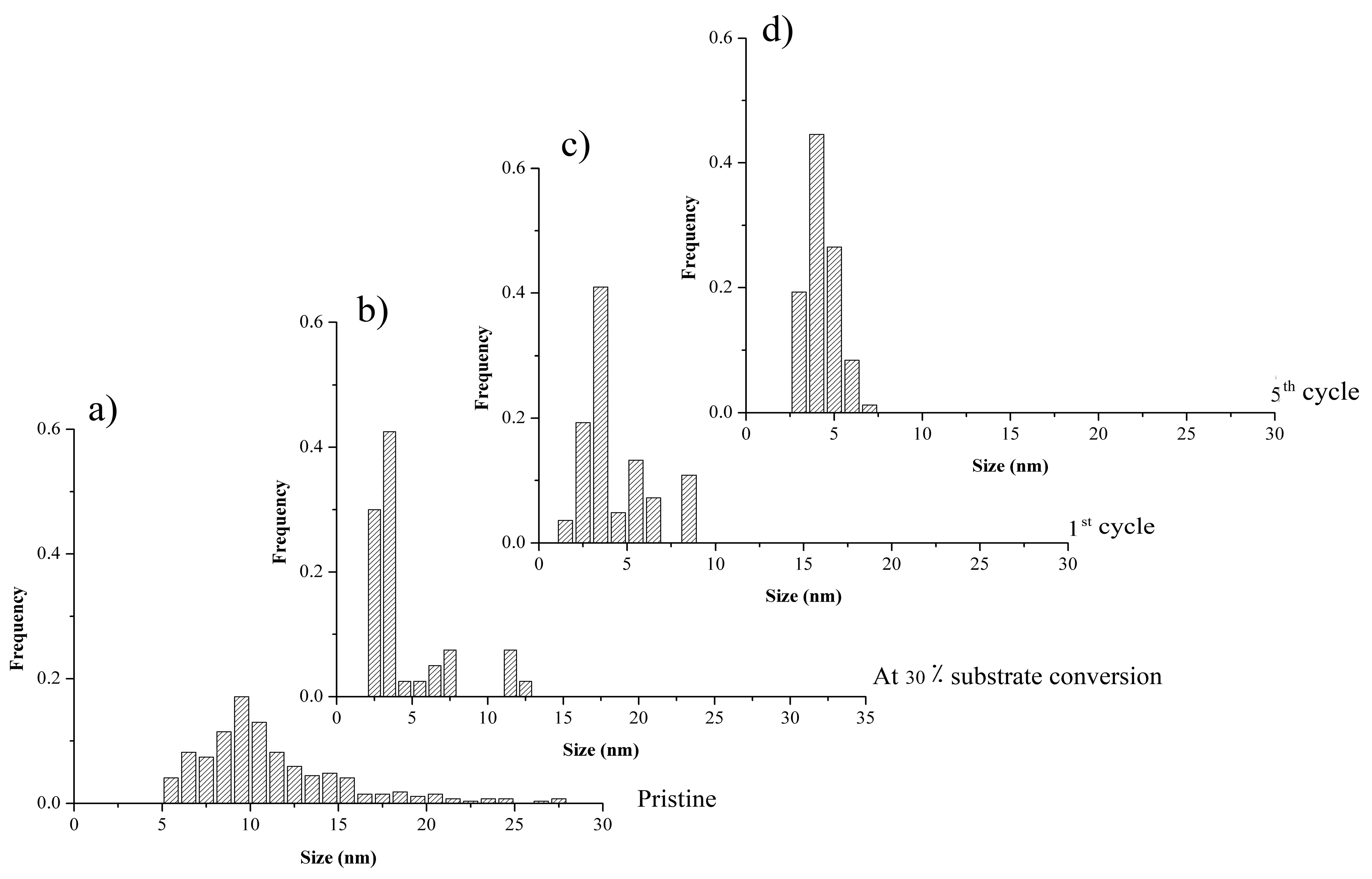Pd NP size distributions in (a) pristine Pd-poland in Pd-polrecovered after (b) 30 min; (c) the first cycle and (d) the fifth cycle of the Suzuki-Miyaura cross-coupling reaction described in entry 1 of Table 1.