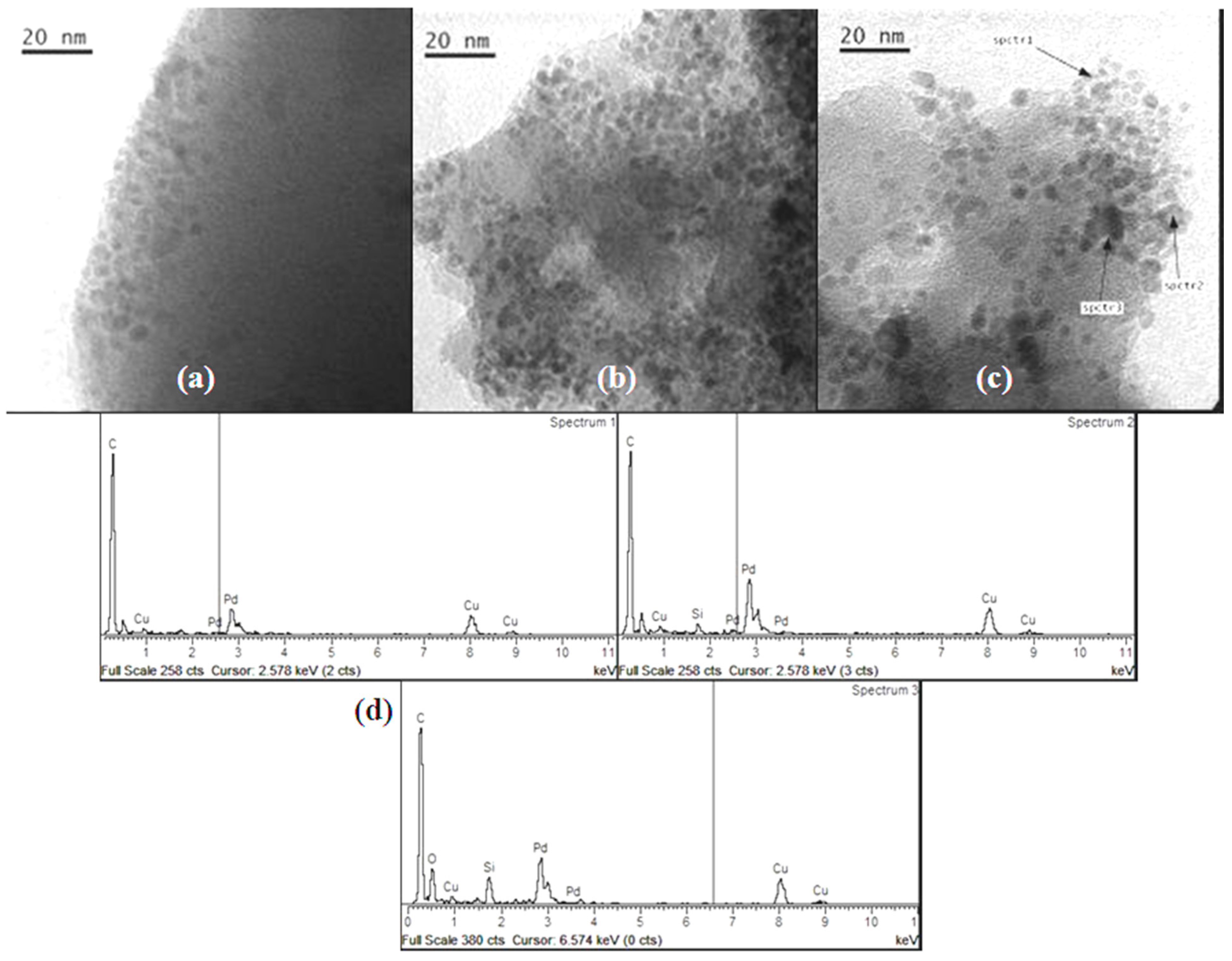 TEM bright field images of Pd-pol after (a) 5 min of the first cycle; (b) the first cycle and (c) the fifth cycle of the TBAB assisted Suzuki-Miyaura cross-coupling reaction described in entry 2 of Table 1; (d) EDS spectra of selected areas of (c) (irregular contamination of silica was observed in Spectrum 3).