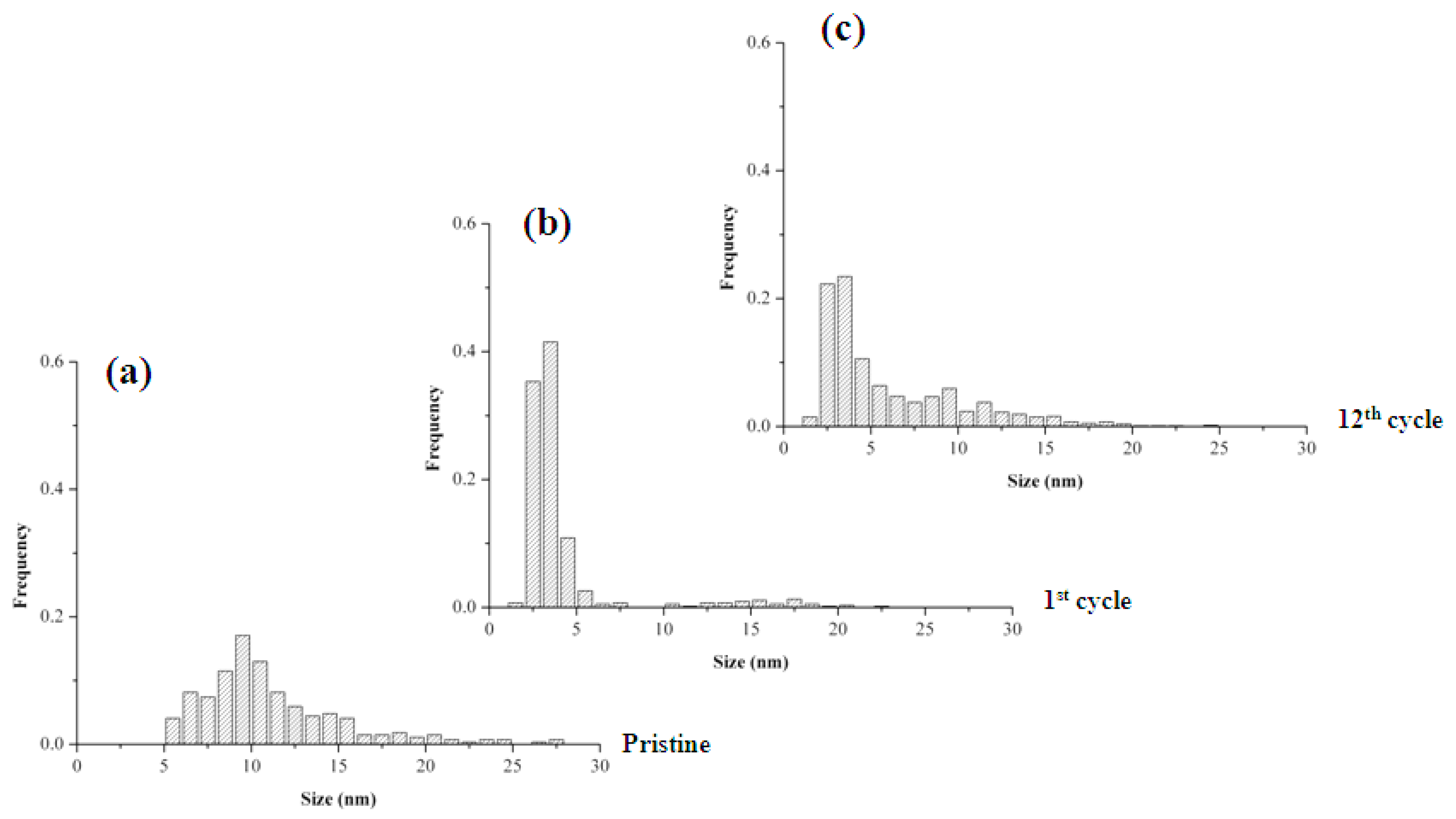Pd NPs particle size distributionsof Pd-pol (a) before; (b) after the first cycle and (c) after the twelfth cycle of nitrobenzene reduction with NaBH4.