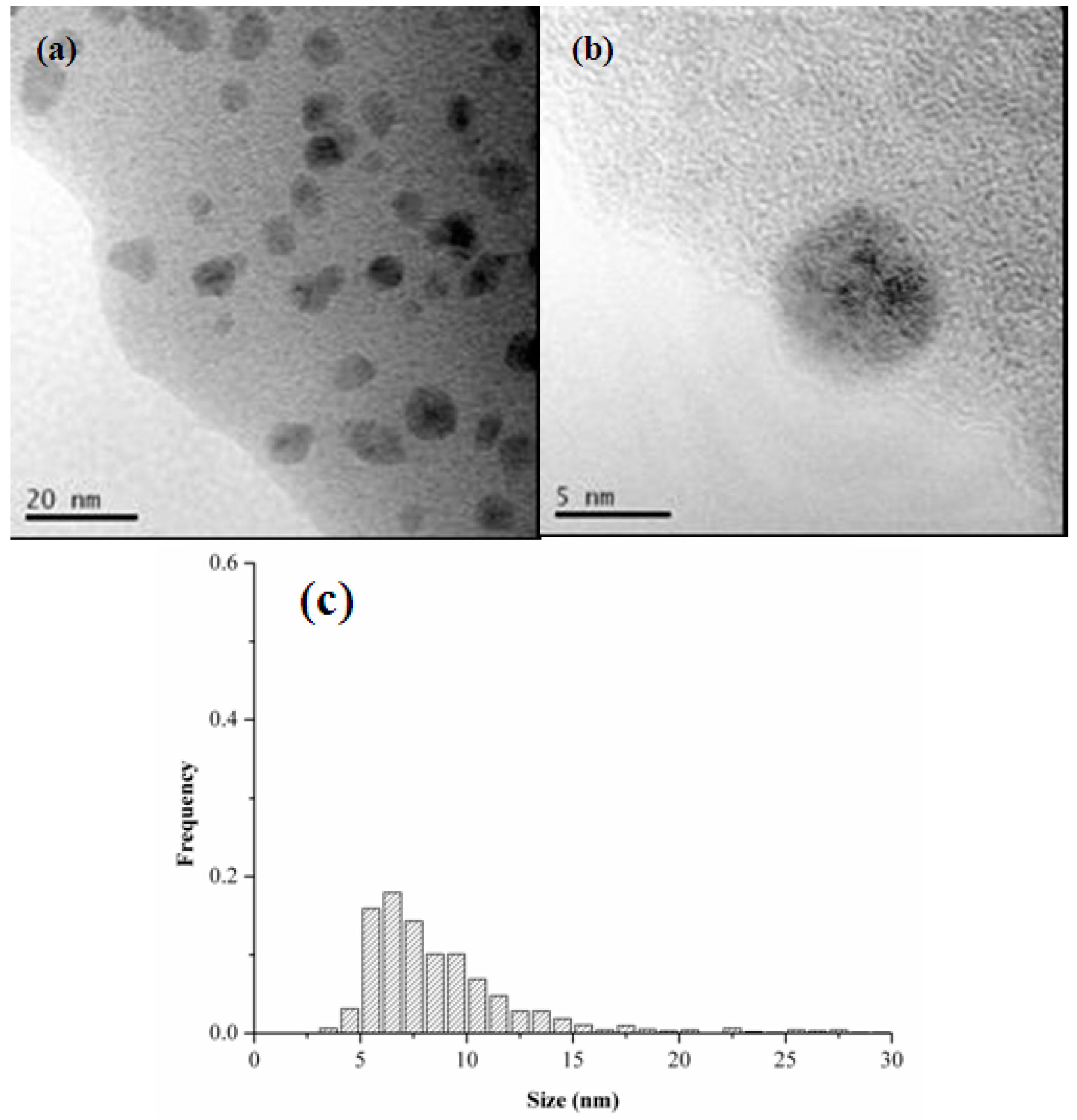 Figure 6 shows TEM images indicating the snapshots of the PdNPs formation after (a) 5 min (at 30% substrate conversion); (b) the first cycle and (c) the fifth cycle of the TBAB assisted Suzuki-Miyaura cross-coupling reaction (conditions described in entry 2 of Table 1).
